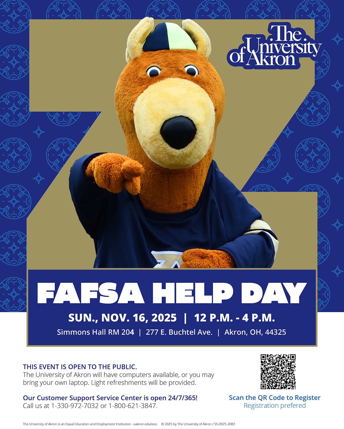 Get help with your financial aid by calling 330-972-7032 or 1-800-621-3847. We'll be happy to answer your questions about FAFSA, scholarships, loans and more.