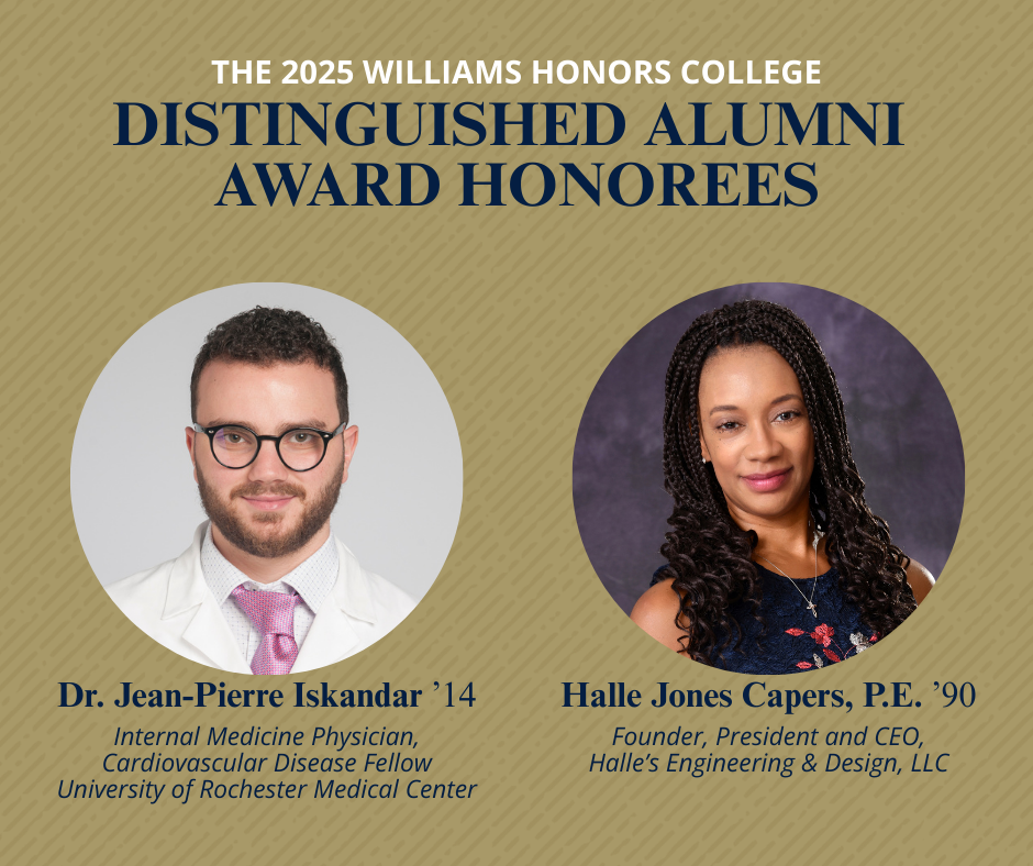 The WHC Distinguished Alumni Award recognizes alumni from the Williams Honors College who have excelled in their professional fields and made significant contributions to their communities, and to their alma mater. “The Williams Honors College is proud to recognize two exceptional alumni for the 2025 Distinguished Alumni Award— Jean-Pierre Iskandar and Halle Jones Capers. These honorees represent the very best of our legacy. Iskandar’s dedication to advancing cardiovascular health and Capers Jones’ leadership in civil engineering and entrepreneurship reflect the excellence, service, and innovation we aim to instill in all our students,” said Fedearia Nicholson-Sweval, vice provost for student pathways and dean of the Williams Honors College.