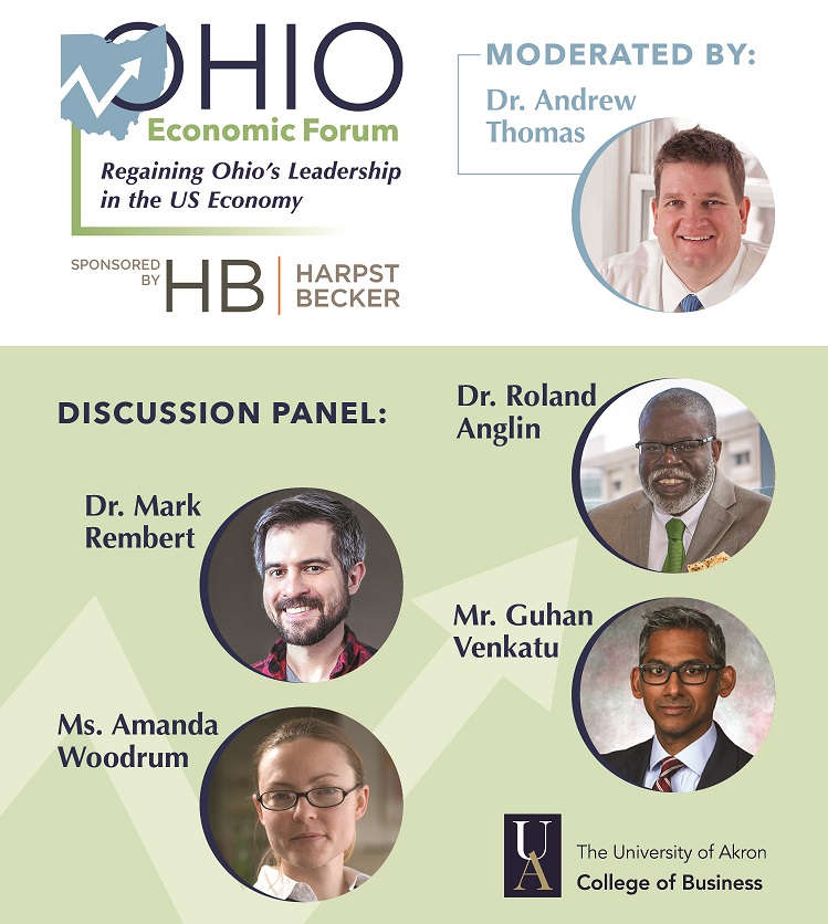 The virtual forum, held on April 30, 2021, and titled “Regaining Ohio’s Leadership in the U.S. Economy,” was presented by the College of Business Department of Economics and sponsored by the law firm Harbst Becker. This year’s forum was based on a recently published report co-authored by UA Associate Professor of Economics Amanda Weinstein, titled “Falling Behind: How Ohio Continues to Lose its Place in the U.S. Economy.” The report, co-authored with Dr. Michael Hicks and Dr. Emily Wornell at the Center for Business and Economic Research at Ball State University, details the economic underpinnings of Ohio’s rise and fall from the third most populous state in the nation. The report asserts that Ohio has been falling behind for over a century and that without a significant course correction, it will only continue to lose ground.