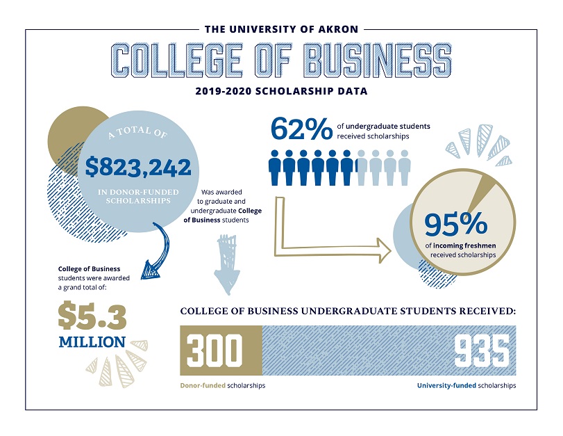 According to a recent study by lender Sallie Mae, families in the U.S. struggle to pay for college tuition without assistance. In fact, more than half of families take out loans to help cover the cost of college attendance, making scholarships and grants even more valuable. The University of Akron (UA) stepped up to help students in the College of Business Administration (CBA) by distributing nearly $5.3 million in grants and scholarships in the 2019-2020 academic year.