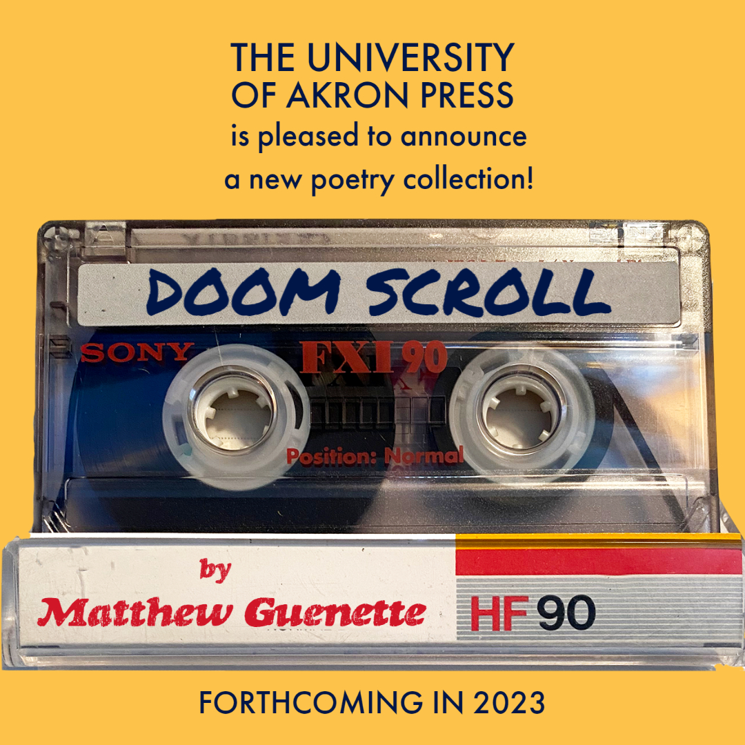 The University of Akron Press is pleased to announce that it will publish Doom Scroll, a new poetry collection by Matthew Guenette. Guenette is the author of two previous collections published by The University of Akron Press, Vasectomania (2017) and American Busboy (2011). His first collection, Sudden Anthem, was published by Dream Horse Press in 2008.